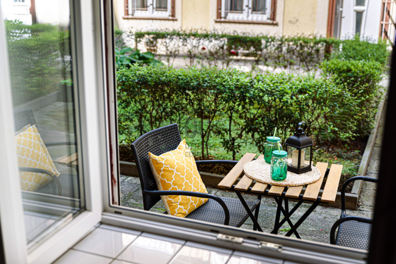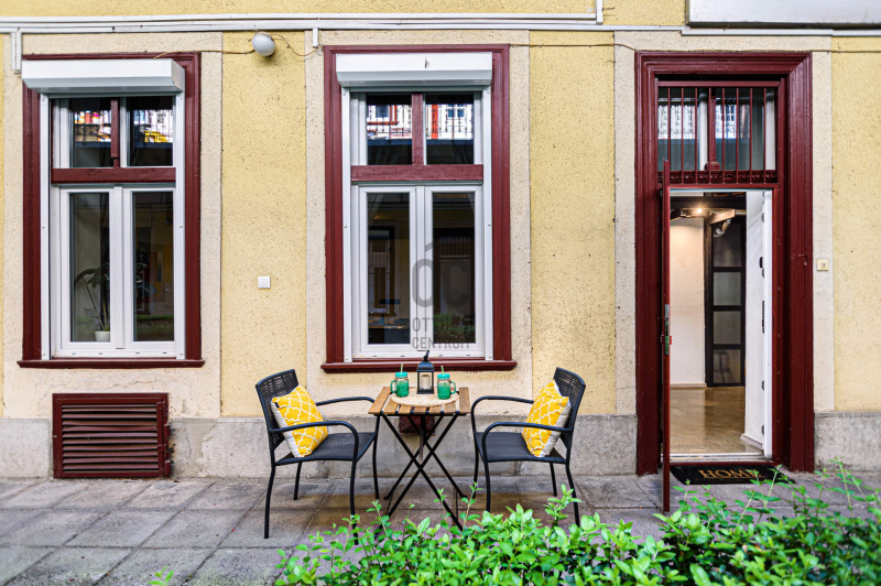 A belső, csendes zöld udvarra néző lakás teljesen felszerelt és bútorozott.