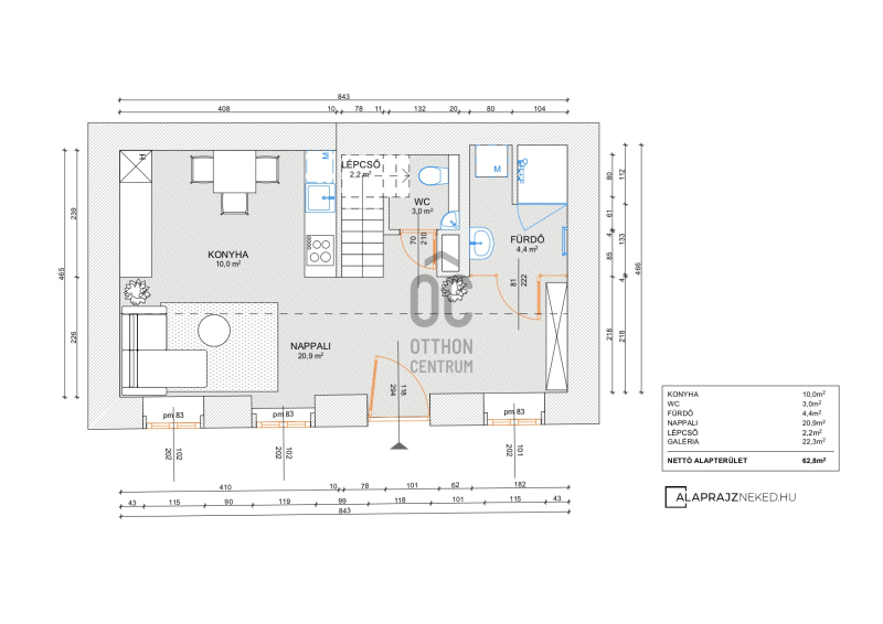 A földszinten tágas, amerikai konyhás nappali, gépesített konyha (Bosch mosogatógép, indukciós főzőlap, sütő, hűtő), tükrös gardrób, épített zuhanykabin, külön WC és tároló található.