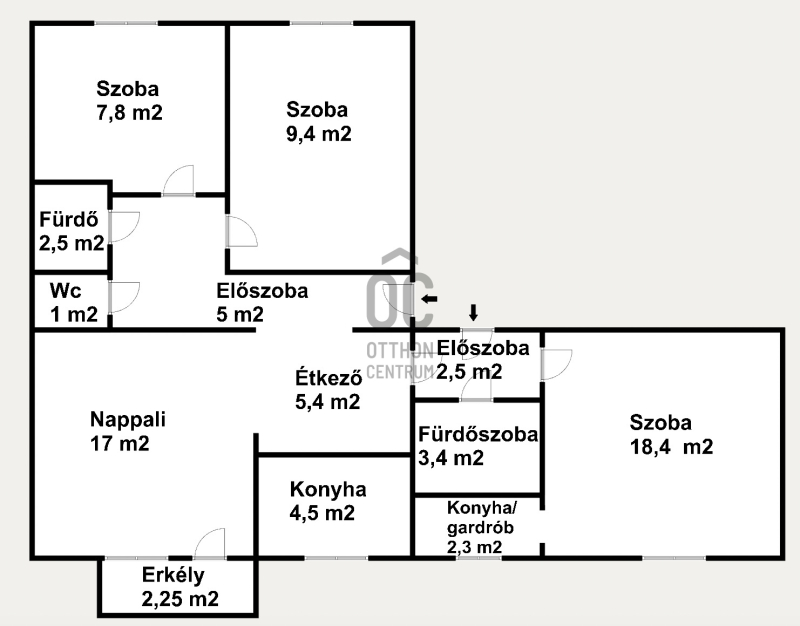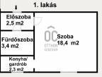 1. lakás részei: szoba, konyha (jelenleg gardrób), fürdőszoba WC-vel, előszoba.