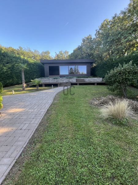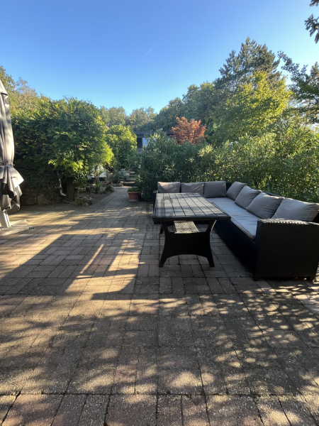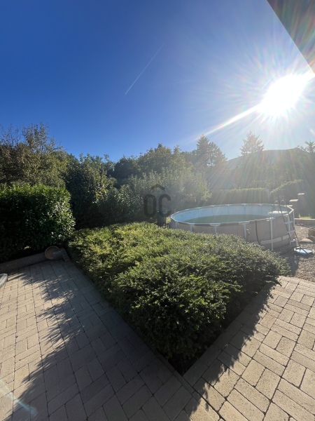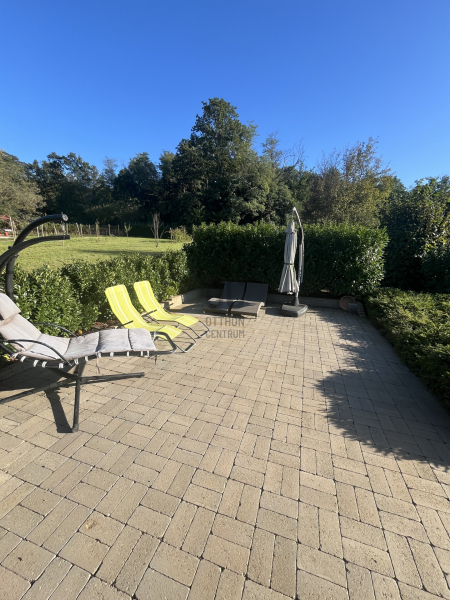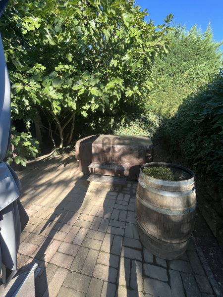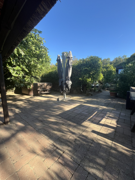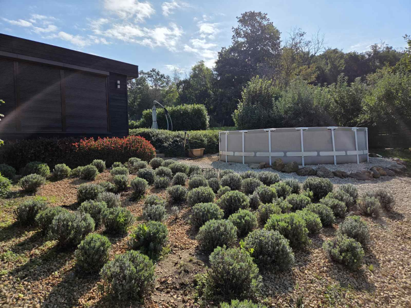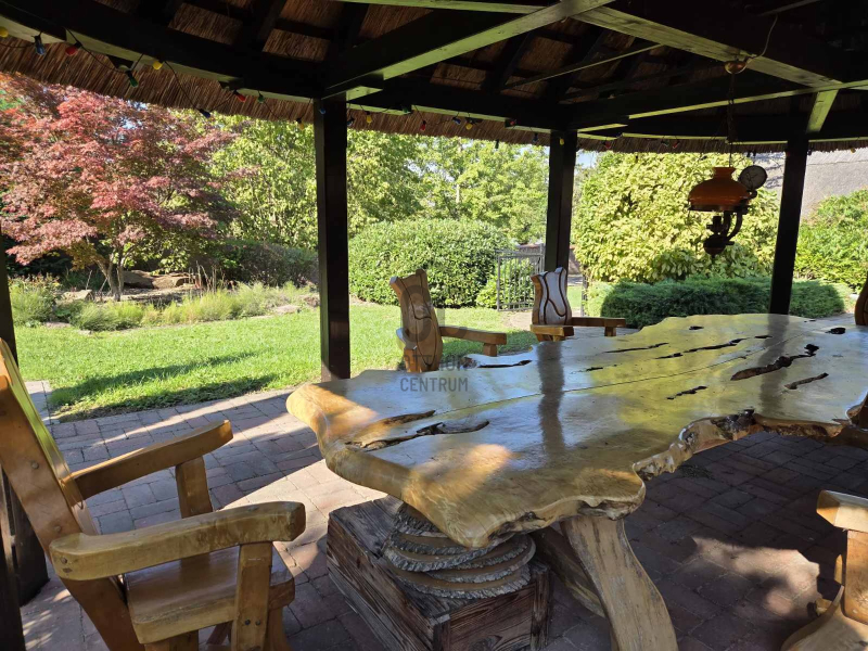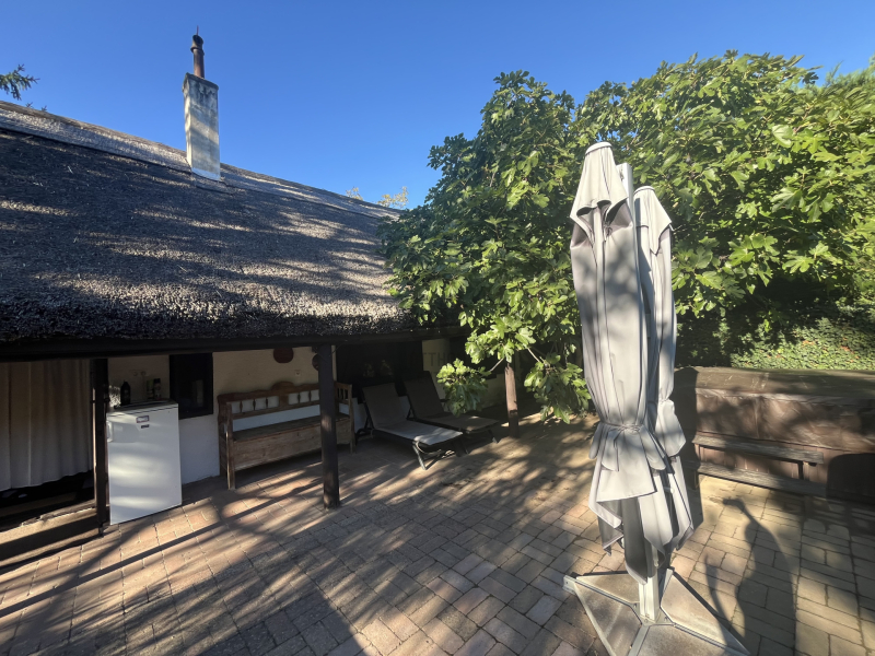 A kert szemet gyönyörködtető, az épület előtt kiépített teraszon helyett kapott egy jakuzzi, társalgásra alkalmas kiülő rész és sütögető helyiség.