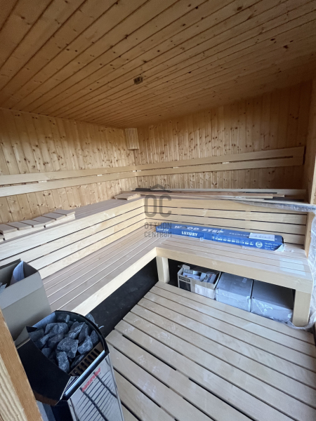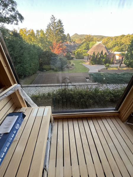 A telek végében egy 40 négyzetméteres alapterülettel rendelkező szaunaház került kialakításra, benne 8 személyes finn szauna, 9 kw-os kályhával, a falon egy parajdi sóképpel, zuhannyal, külső pihenővel, ahonnan a kilátás a Badacsonyra néz.