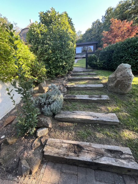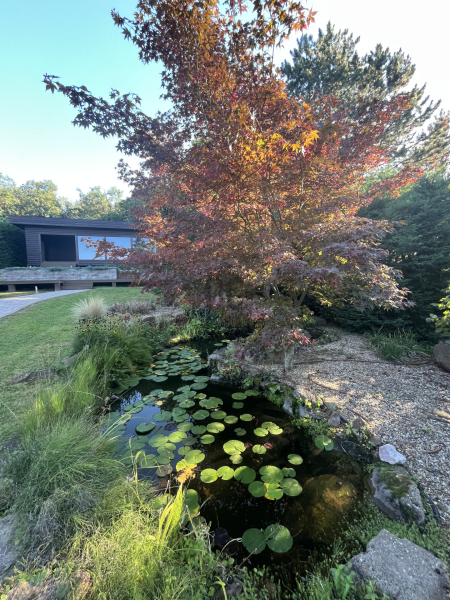A kert hátsó részében található egy hangulatos kerti tó, amit egy vörös levelű japán juharfa tesz teljessé.