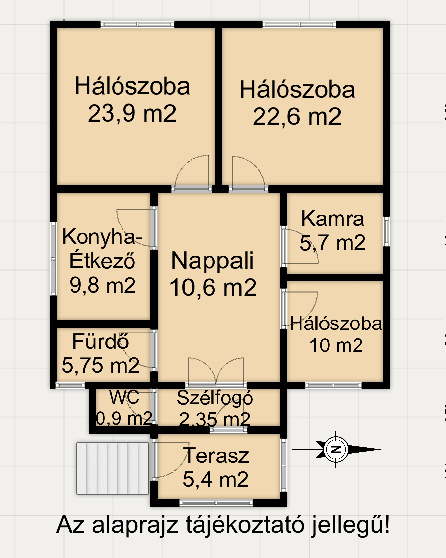 - 3 tágas szoba+ nappali, konyha + étkező, fürdőszoba, külön WC, közlekedő, terasz, kamra, tároló helyiségekből áll.