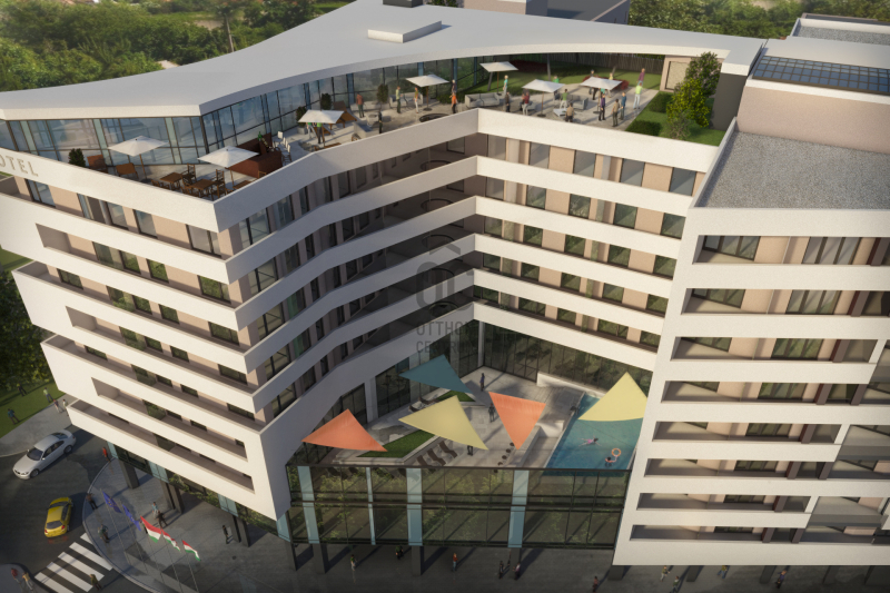A földszint + 8 emelet magas épületet elegáns, fákkal, cserjékkel tarkított terek veszik körül.