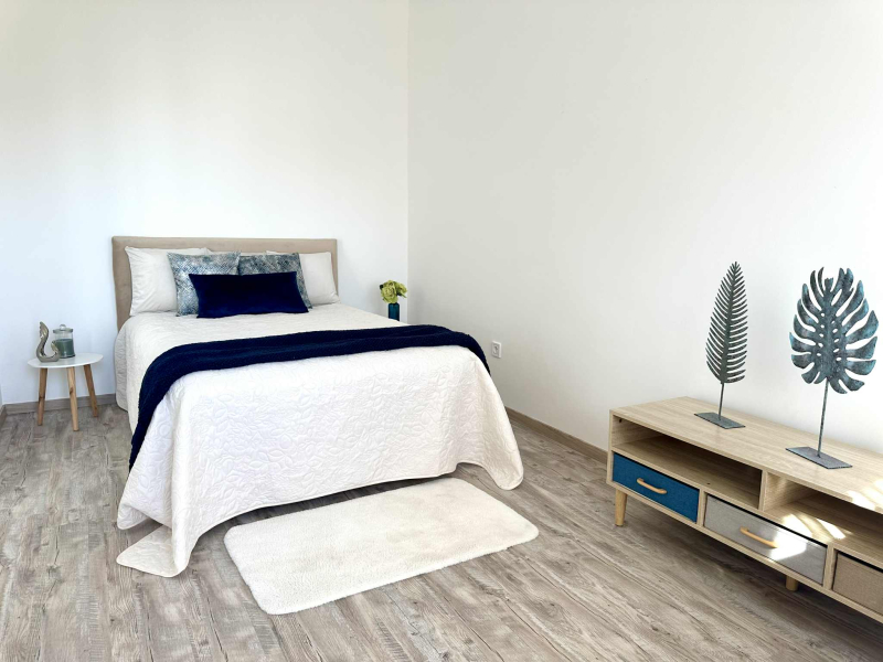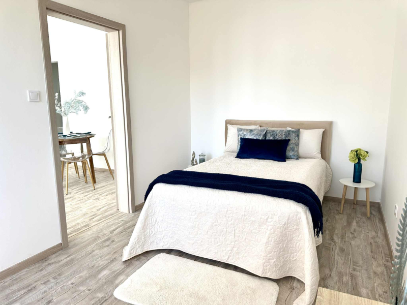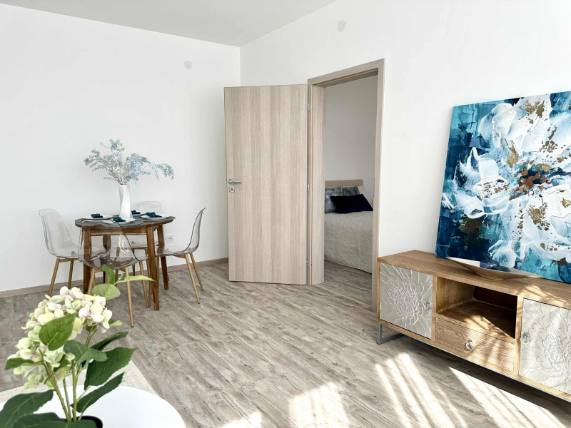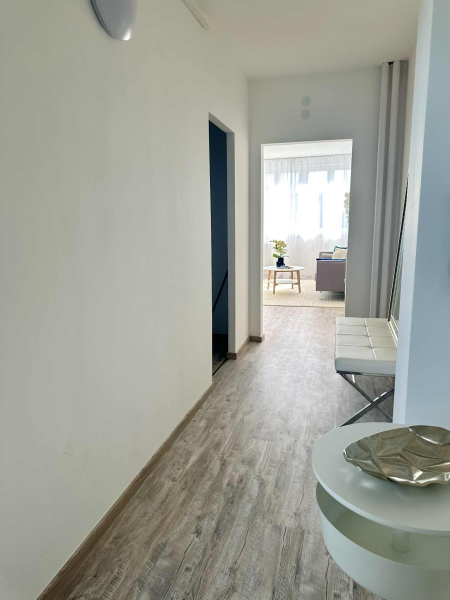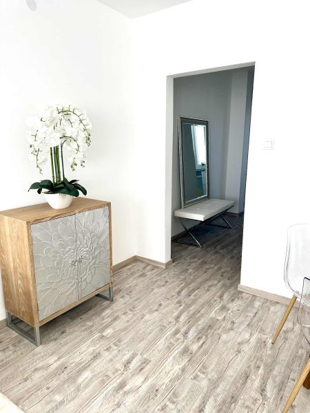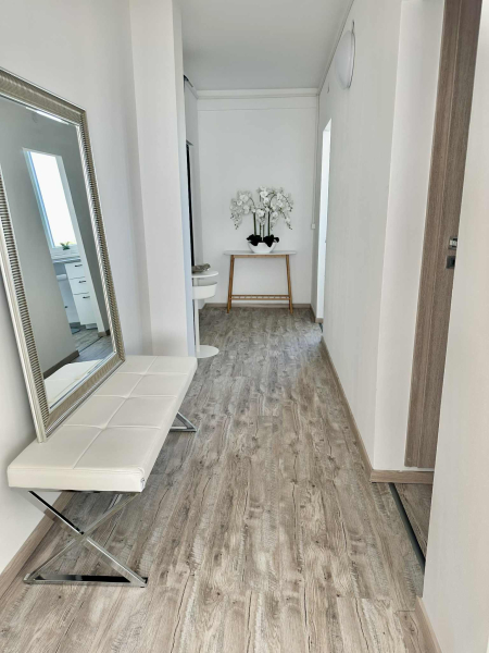 A szobák és az előszoba új vizálló laminált parkettával burkoltak , a bejárati ajtó biztonsági ajtó .