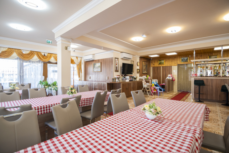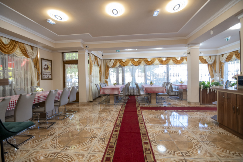 A tágas étkezőben svédasztalos reggelikhez kialakított pult, zenekari sarok és elegáns bútorzat biztosítja a kellemes atmoszférát.