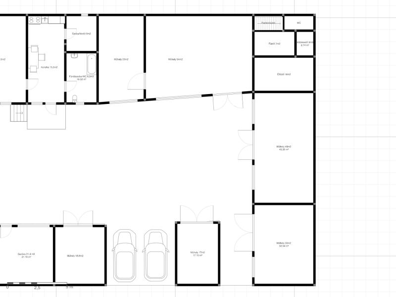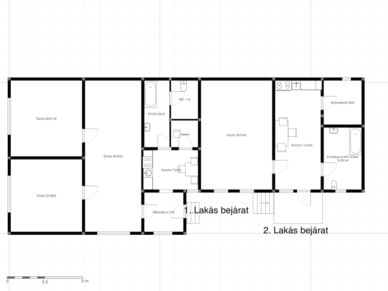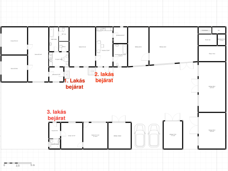 Lakóépület: nettó 174 m² (jelenleg 3 külön lakás), bruttó 418 m²