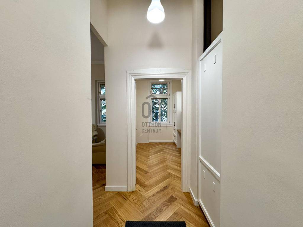 LAKÁS: 69 nm, teljesen felújított, bútorozott és gépesített (hűtő, mikró, mosó- és szárítógép), 2 és fél szobás, nagyon csendes, saját cirkófűtés padlófűtéssel, gyönyörű vadonat új valódi fa parkettával, teljes értékű konyhával a nappaliban, vadonat új 3 rétegű fa ablakokkal.