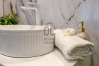 A fürdő épített tusolóval lett megtervezve és megépítve gyönyörű burkolattal és szaniterekkel.