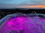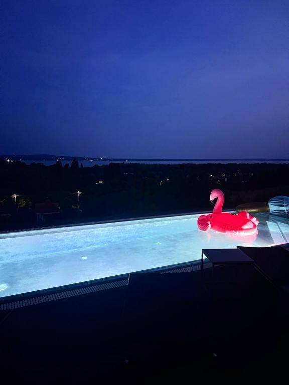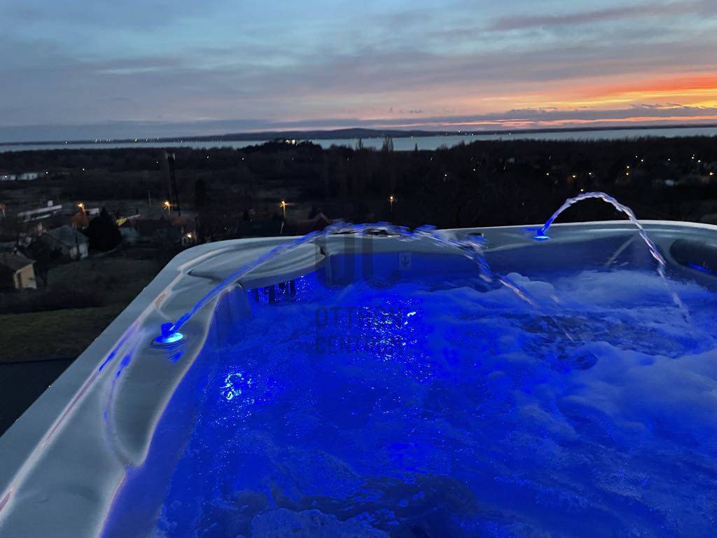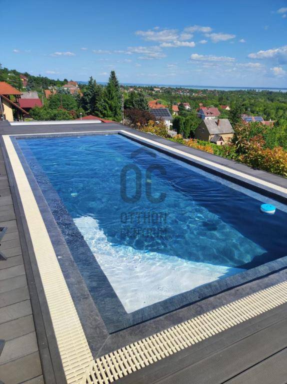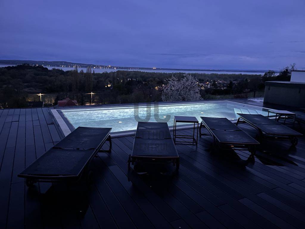 Von der 150 m² großen, sonnigen Terrasse eröffnet sich ein unvergleichlicher Blick auf den Balaton, den man auch aus dem beheizbaren Infinity-Pool genießen kann – der perfekte Ort zum Entspannen oder für gesellige Stunden mit Familie und Freunden.