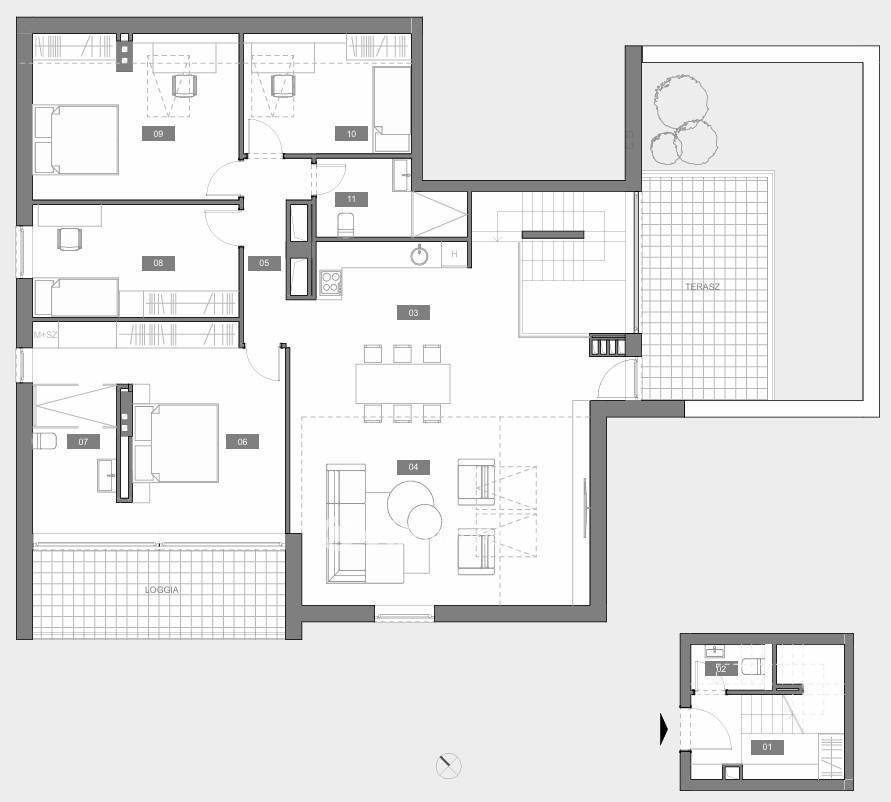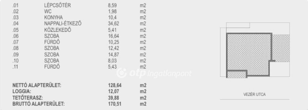 Az épület 3. emeletén található összkomfortos Nappali + négyszobás lakás alapterülete 128 négyzetméter, amit 12 négyzetméteres loggia és 40 négyzetméteres terasz tesz még tágasabbá! A terasz a 45 négyzetméteres nappali-konyha-étkezőhöz csatlakozik. A hálók a nappalitól jól elkülönültek, egy nagyobb család számára ezeket két zuhanyzó-wc és egy külön wc szolgálja ki.
