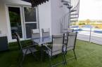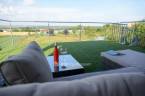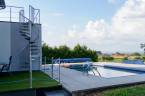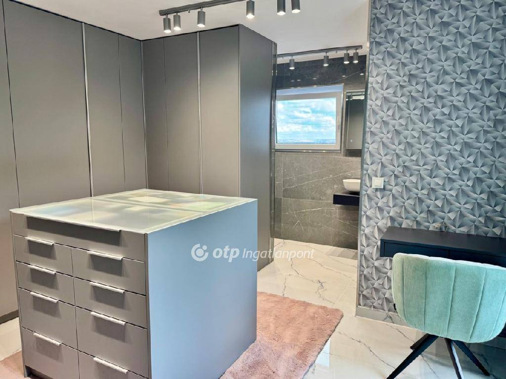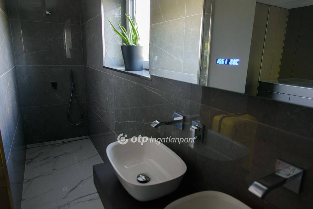 A kertben található a ház egyik legkülönlegesebb része: egy 8x4 méteres, feszített víztükrű medence, napkollektoros fűtéssel és ellenáramoltatóval. A teraszok közül az emeleti örökpanorámás, ahonnan minden évszakban gyönyörű kilátás nyílik a környékre.