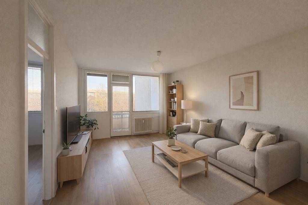 Az ingatlan helyiségei: nappali/szoba (18 nm), szoba (12 nm és 7 nm), konyha (kb. 5 nm), étkező (kb. 7 nm), fürdőszoba (5,2 nm), különálló mellékhelyiség (1,5 nm), előszoba (3,3 nm), valamint egy erkély (kb. 8 nm).