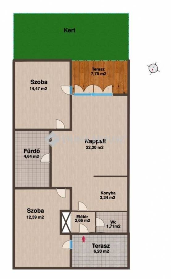 Első- és hátsó terasz, hátul közvetlen kertkapcsolattal