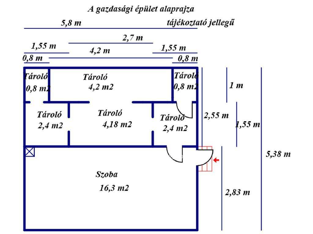 A fából épült gazdasági épület részben beton alapra, részben beton cölöpökre ültetve készült. A beton alappal készült rész körben szigetelt. A tető szerkezete fából készült, héjazata hullámpala borítású. A külső- és belső nyílászárók eredetiek, fából, készültek. A gazdasági épület háromfázisú áram bekötéssel rendelkezik (3*25A ). Az épület fűtése jelenleg nem megoldott. Egy vegyestüzelésű kémény található az épületben, kályha telepítésével a fűtés megoldható. A víz ellátáshoz, a kert locsolásához fúrt kút rendelkezésre áll.