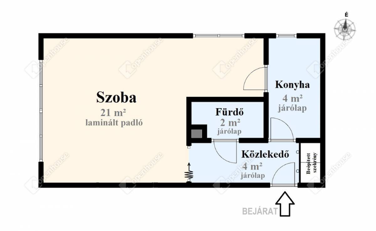 - laminált parkettás szoba, a többi helyiség járólapos, a falak festettek, gletteltek