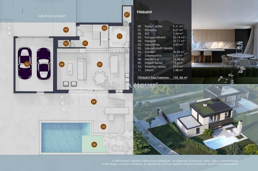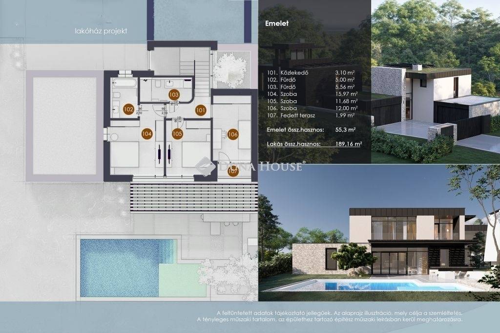 Panorámás, új építésű, luxusotthon Csillebérc, Farkasvölgy és Széchenyihegy határán!Lenyűgöző helyen, egy védett természetvédelmi terület mellett kínálunk megvételre egy 189 négyzetméter területű, belső 2 szintes, kültéri medencés luxus ház projektet.Ez az exkluzív fejlesztés egy déli fekvésű, panorámás, 1700 m² területű telken valósul meg, érintetlen természettel körülvéve beleértve a cédrus- és fenyveseket, valamint a buja erdősávot. Az elfogadott építészeti koncepció szerint két építészetileg harmonikus villa épül, amelyek tökéletesen illeszkednek a tájba.Mind a telek, mind a leendő lakóházak lélegzetelállító kilátást nyújtanak a Széchenyi-hegyre és a környező dombokra és erdőkre, biztosítva a nyugodt és kiváltságos életélményt.Az eladó ház két szintes, a földszinten a nappali- konyha, előtér egyben 62.32m2, melyben egy fa tüzelésű kandalló épül. A földszinten található még egy toalett kézmosó (1.5m2), illetve egy belső, nyitott 7.48 m2-es átrium, melyben egy impozáns fát képzelt el a tervező, amelyet az egész nappali -konyhából látni lehet. (az átriumnak üveg falai lesznek, lásd a látványterveken). A lépcsőház és az előszoba két szintes, így a házba történő belépéskor több, mint 5 méteres belmagasság fogadja az érkezőt. Az átriumból nyílik a 2.53m2-es gépészeti helység és tároló, ahol a ház modern fűtési, hűtési rendszere és gépészete kerül elhelyezésre. A nappali- konyha részből nyílik a részben fedett terasz (összesen 41.5 m2), illetve a kert. A garázs/ tároló 36.83m2, két kocsi beállásra alkalmas, illetve ide lehet kialakítani további tároló kapacitást. Továbbá a lépcső alatt is háztartási tároló kerül kialakításra.Az emelten 3 hálószoba és két fürdőszoba kerül kialakításra. A főháló (15.97m2), melyhez külön kádas, toalettel ellátott fürdőszoba tartozik (5m2), illetve egy óriási terasz (36.83m2) a garázs tetején. Az emeleten található még két további szoba (11.68m2 és 12.00m2) és egy zuhanyzós, toalettel ellátott fürdőszoba (5.56m2). A 12m2-es szobához tartozik egy 2m2-es terasz is. A szobák és a nappali- konyha mind déli tájolásúak, ahogy a kert is.A beruházó magának keres szomszédot! (A másik - a látványterven látható - ház a beruházó saját háza lesz)A helyiségek a vevő igénye alapján változtathatóak! (A műszaki lehetőségek korlátjai között)Közlekedés:A telek három irányból is megközelíthető:-A Farkasréti temető irányából (az erdei Edvi Illés úton keresztül),-Gazdagrét felől (Adorján út),-illetve Normafa felől is (Magas út)Műszaki paraméterek (melyeket a vételár tartalmaz):- Hőszigetelt 25 cm vázkerámia tégla és 20 cm hőszigetelés.- Alumínium nyílászárók, 3 rétegű hőszigetelt üveg.- A ház energetikai szempontól kvázi passzív ház.- Távvezérelt kerti- és garázskapu.- Hőszivattyú, padló fűtés és mennyezet hűtés- fűtés.- Telepített vízszűrő rendszer- Napelem előkészítés- Beltéri kandalló- Fa beltéri ajtók.- Biztonsági bejárati ajtó- Burkolatok- SzaniterekVárható átadás ideje:2026 IV. negyedévAmennyiben hirdetésem felkeltette érdeklődését, valamint további információra van szüksége, várom megkeresését.