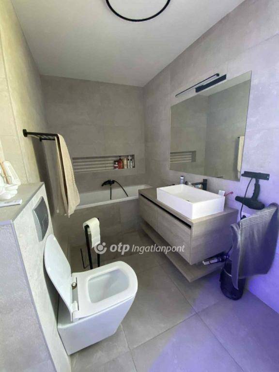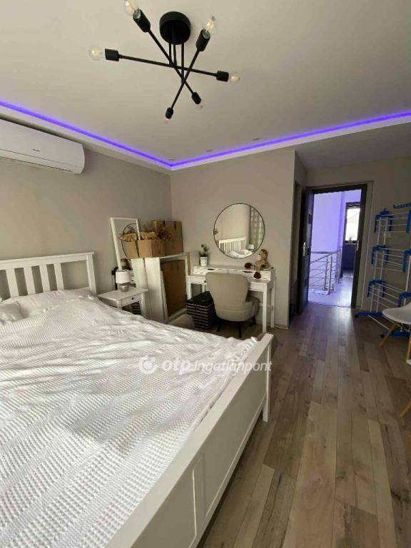 A lenti és az emeleti lakóteret egy gyönyörű, világos lépcsőház köti össze. A ház 4 szobája és a nappali járólap burkolattal rendelkezik, a többi helyiség laminált parketta burkolatú. A fürdőszoba kényelmes, nagyméretű zuhanyzó került beépítésre. Gáz cirkó kazán szolgáltatja a melegvíz ellátását és a fűtését, padlófűtéses hőleadással, erre a nappali díszeként is pompázó és a téli estéket hangulatossá varázsló kiválóan működő kandalló is rásegít valamint 4 db hűtő-fűtő klíma.