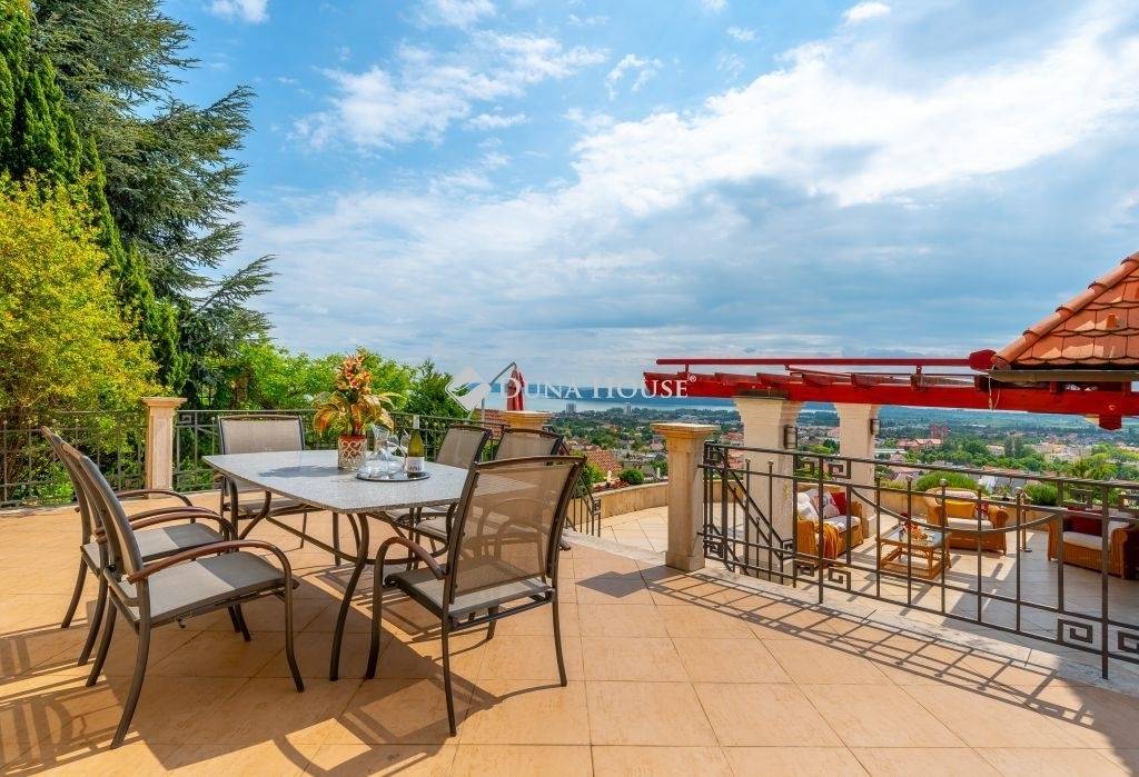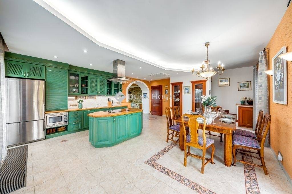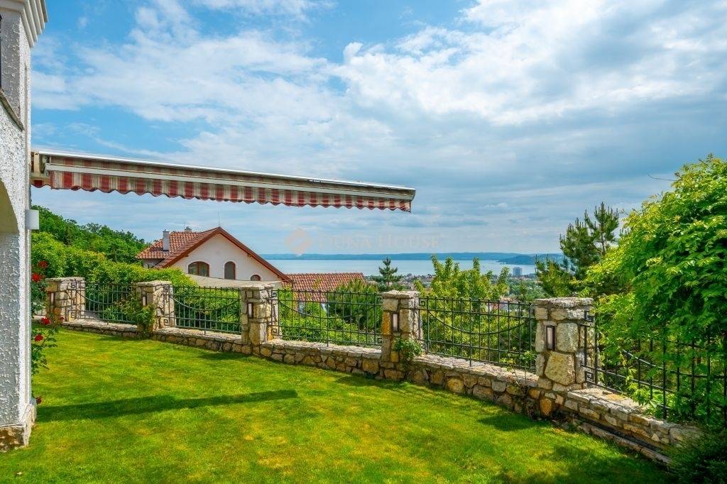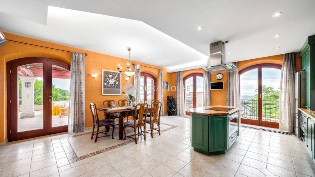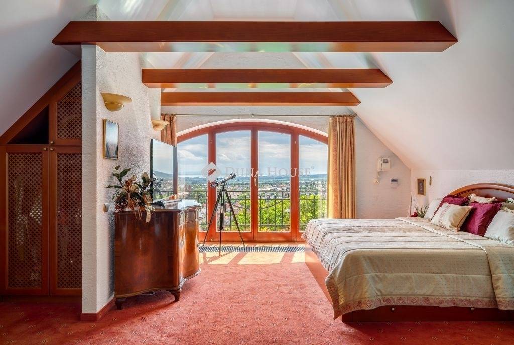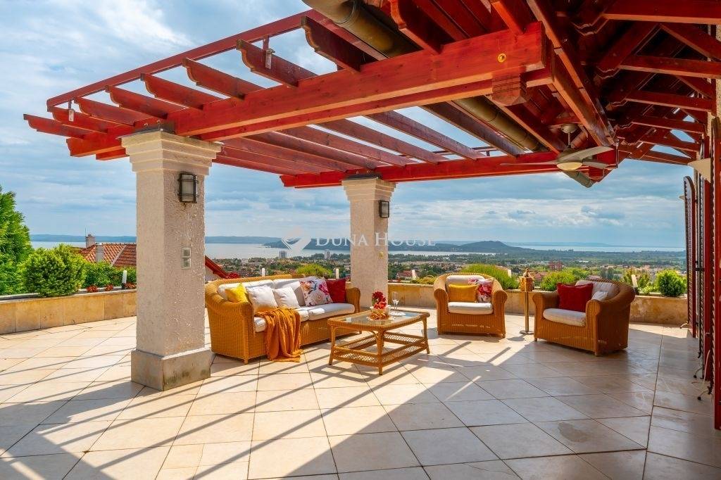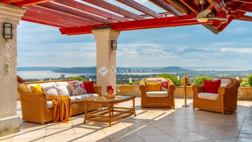 A Balaton legszebb panorámája, parkosított kert, 2 lakosztályos luxusnyaraló Balatonfüreden vált elérhetővé.6 beálló a kertben, 2 lakosztály, medence, jacuzzi, tágas épített terek az udvarban és a házban egyaránt - 2004-ben épült villa, ahol a panoráma, a minőségi anyagok és az átgondolt műszaki megoldások igazán érvényesülnek. A képek és a videó igyekszik bemutatni ezt a valóban csak személyesen átélhető összhangot.Minden igényt kielégítő gépiesített konyha étkezővel, előtér és dolgozó sarok, vendégmosdó, kandallós nappali terasszal a panorámás kert felé a földszinten, 2 gardróbos háló, fürdő, jól kihasznált terek az emeleten, nagy szobás, konyhás, fürdős második lakosztály, borospince, mosókonyha, wellness medencével és jacuzzival, tárolók találhatóak az épület alsó szintjén. A ház hasznos alapterülete: 427 nm + a teraszok.Óriásfák, kertész által tervezett tavasztól őszig pompázó, automatizált, parkosított kert, kerti étkező, mely a teljességet biztosítja. A telek mérete: 761 nm.Műszaki felszereltség:- cseresznyefa nyílászárók, - spanyol burkolatok,- kerámia kandalló,- Daikin inverteres hűtő-fűtő, pollenszűrős klíma H tarifás órával,- Buderus kazán,- padlófűtés, padló radiátor, fali radiátor kombinációja,- központi porszívó,- riasztórendszer,- öntözőrendszer,- fúrt kút, mely ivóvíz tisztaságúElhelyezkedésének, összetételének, nagyságának, megközelítési és széles hasznosítási lehetőségeinek köszönhetően saját részre, emellett befektetésnek is egyaránt optimális választás. Kisebb családok, tágas, igényes és egyben elegáns helyet keresők, nagy baráti, ismeretségi körrel rendelkezők, nyugodt elhelyezkedést keresők joggal érezhetik, hogy megtalálták, amire szükségük van.További kérdéseivel, megtekintési szándékával várom hívását.The most beautiful panorama of Lake Balaton, a landscaped garden, a luxury holiday home with 2 suites has become available in Balatonfüred.6 parking spaces in the garden, 2 suites, swimming pool, jacuzzi, spacious built spaces in the yard and in the house - a villa built in 2004, where the panorama, quality materials and thoughtful technical solutions really prevail. The pictures and the video try to present this harmony that can only be experienced in person.A mechanized kitchen with dining room that meets all needs, a hallway and work corner, a guest toilet, a living room with a fireplace and a terrace facing the panoramic garden on the ground floor, 2 bedrooms with wardrobes, a bathroom, well-utilized spaces on the first floor, a second suite with a large room, kitchen, bathroom, wine cellar, laundry room, a wellness pool and jacuzzi, storage rooms are located on the lower level of the building. The useful floor area of the house: 427 sq m + the terraces.Giant trees, a gardener-designed, automated, landscaped garden that is magnificent from spring to autumn, a garden dining room, which ensures completeness. The of the plot: 761 sq m.Technical equipment:- cherry wood windows,- Spanish tiles,- ceramic fireplace,- Daikin inverter cooling and heating, pollen-filtered air conditioning with H tariff clock,- Buderus boiler,- combination of floor heating, floor radiator, wall radiator,- central vacuum cleaner,- alarm system,- irrigation system,- drilled well, which has drinking water purityThanks to its location, composition, , accessibility and wide utilization possibilities, it is an optimal choice for both your own home and for investment.Smaller families, those looking for a spacious, sophisticated and elegant place, those with a large circle of friends and acquaintances, and those looking for a quiet location can rightly feel that they have found what they need.I look forward to your call with further questions and viewing intentions.