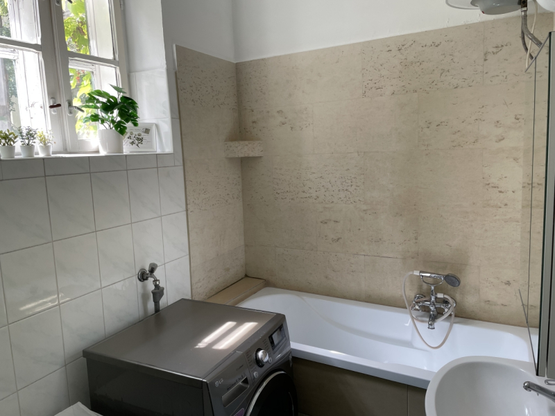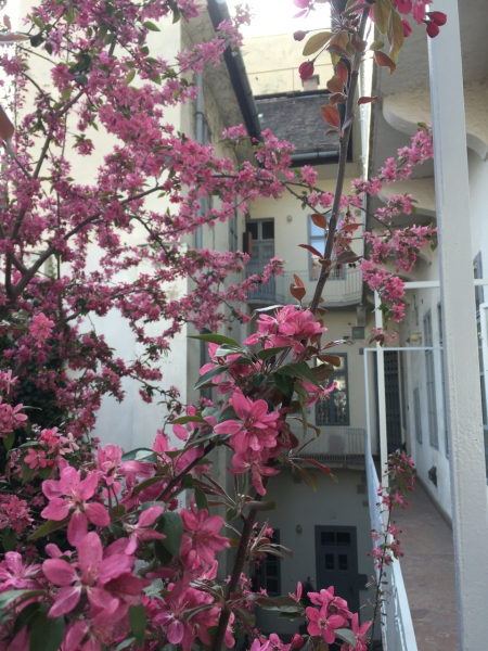A lakás déli tájolású, az ablakok a templom kertjére néznek, ami különleges atmoszférát ad a térnek.
