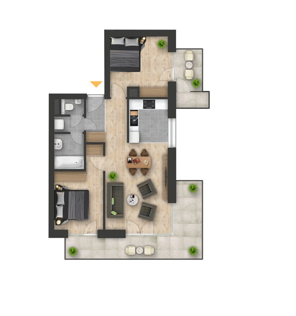 Az alaprajzi kialakítás kiemelkedően praktikus! A lakást tágas és világos terek jellemzik, a nappali konyharész kellően elszeparált és a 2 hálóteret tökéletesen elválasztja egymástól, megmarad az intimitás!