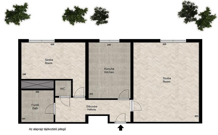 A lakás központi helysége egy 20 nm-es dny-i fekvésű nappali. Szomszédságában találjuk a 9 nm-es ablakos konyhát és az ugyancsak dny-i fekvésű, 11 nm-es, szeparált hálószobát.
