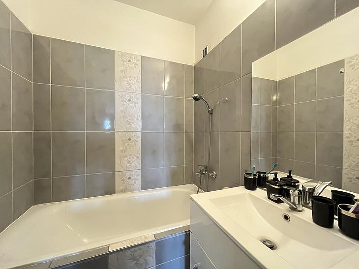 A fürdőszoba új burkolatot kapott, kádas. A mosógép be-és kiállása a gardróbszobába lett kialakítva.