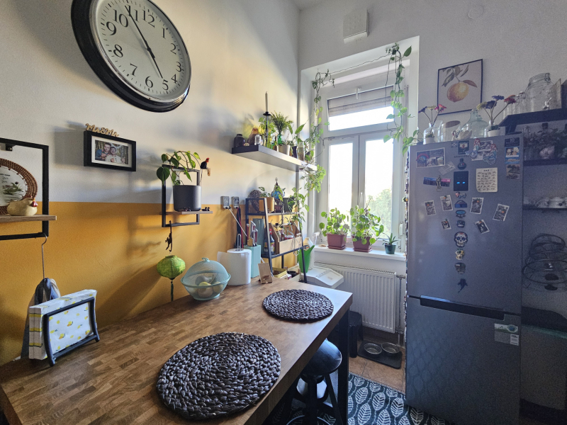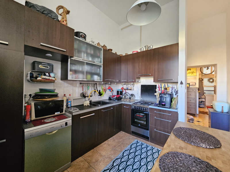 A konyha is kényelmes méretű, ide tervezett bútorral, reggeliző asztallal sok-sok fénnyel a lakás másik kedvelt helyszíne.