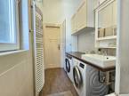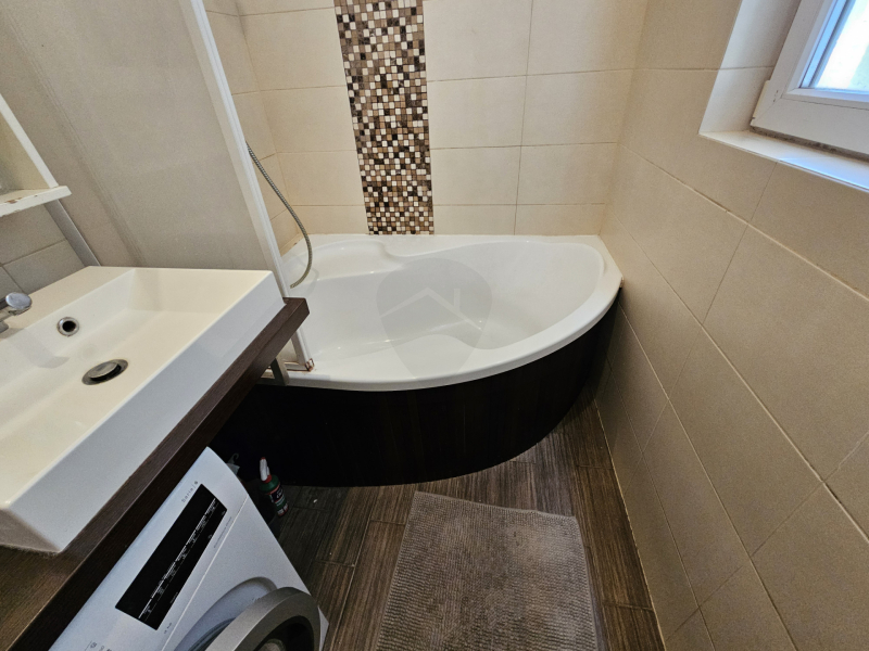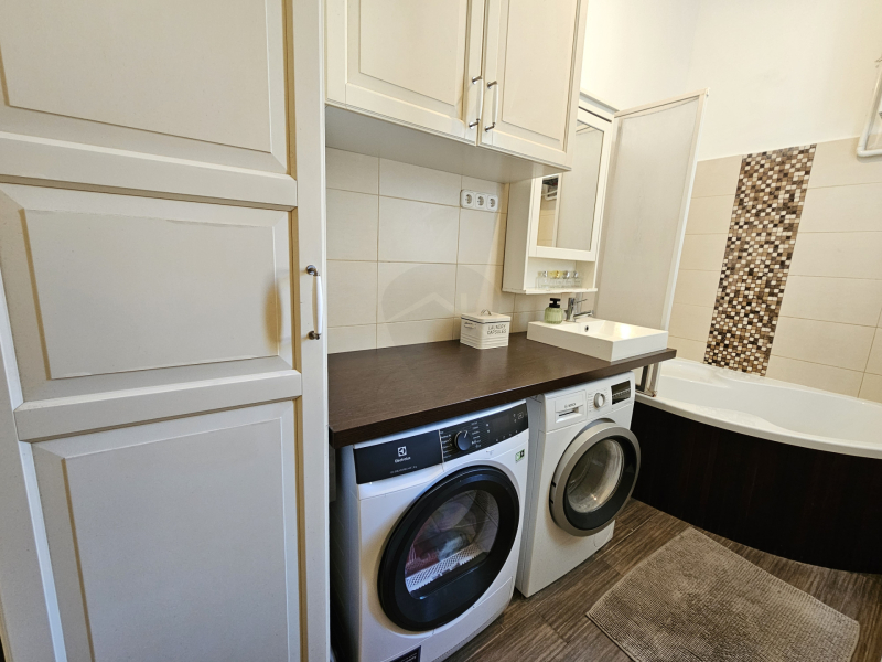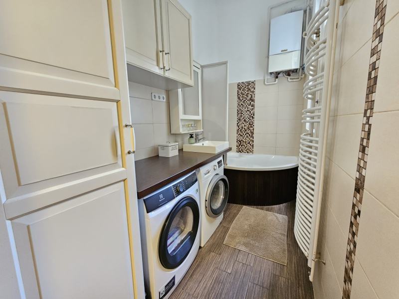 A lakásban kádas fürdőszoba található hatalmas ablakkal, itt elfér kényelmesen a mosógép és a szárítógép is.
