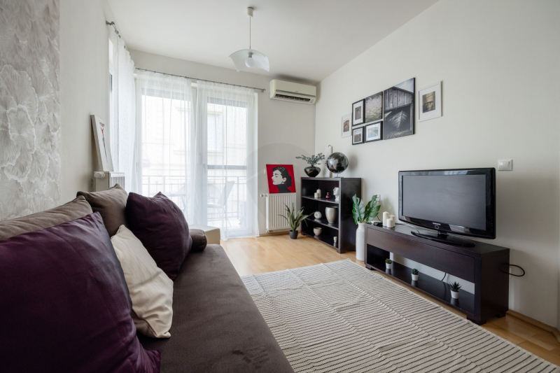 Kiadó egy stílusos, modern, 2 szobás ERKÉLYES lakás a belváros egyik legkedveltebb utcájában, egy újépítésű társasház 5. emeletén – lifttel, 24 órás portaszolgálattal!