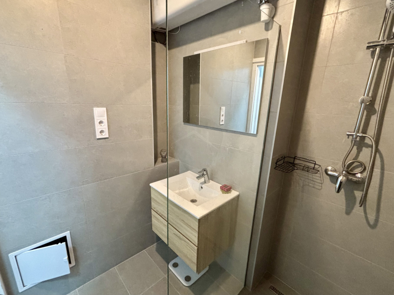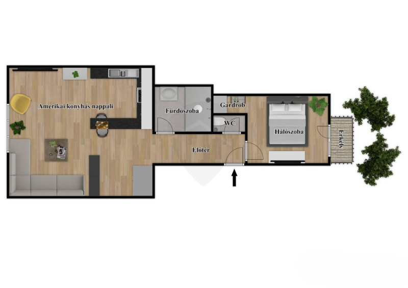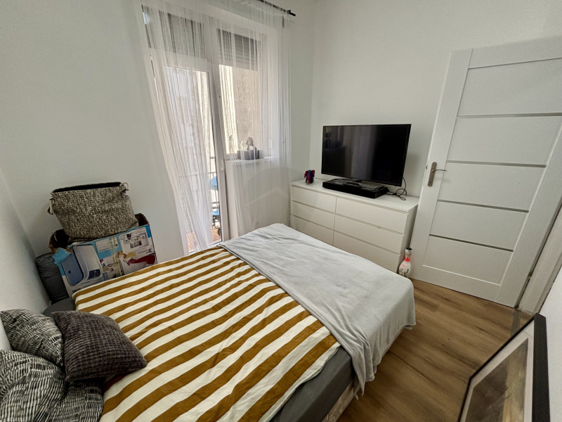A felújítás során a lakás praktikus, élhető elrendezés kapott, a bejárati ajtón belépve az előtérbe érünk, velünk szemben található a letisztult, tágas, zuhanyzós fürdő, illetve külön helyiségben a WC. Tőlünk jobbra nyílik a hálószoba, melyhez a 2 m²-es, hangulatos erkély tartozik, ahol zöldre nyíló kilátás mellett jól esik egy reggeli kávé, vagy egy fárasztó nap után egy pohár bor. A hálóban helyet kapott egy praktikus beépített gardrób, melynek köszönhetően a tárolás is biztosított. A hálóval szemben, az előtértől balra az amerikai konyhás nappali található, egyedi tervezésű konyhabútorral, illetve teljes felszereltséggel.