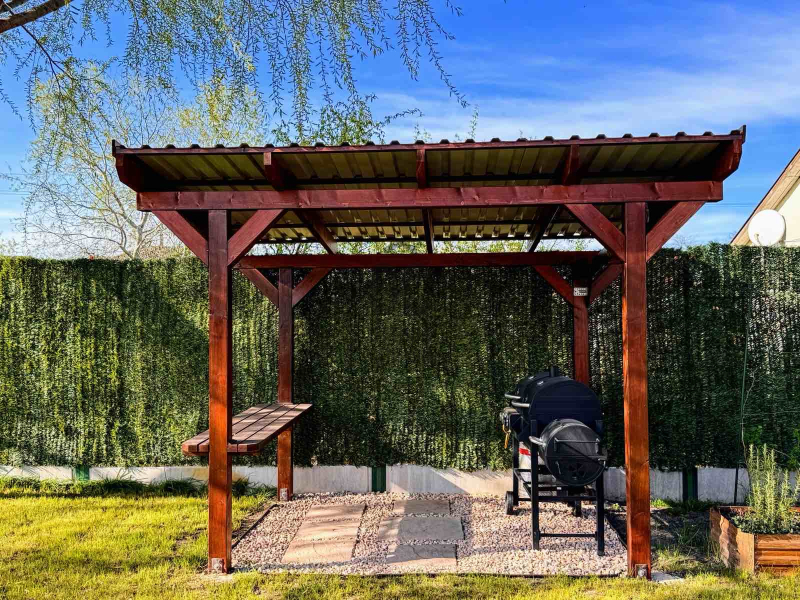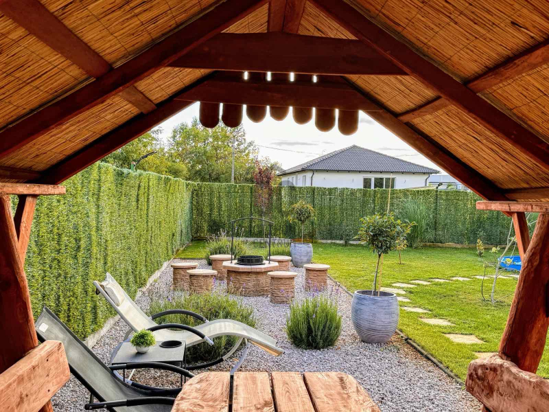 Tágas, parkosított kert 725 m²-en, egy fedett terasszal (17,93 m²), fa fedésű kerti pihenővel és grillezőrésszel.