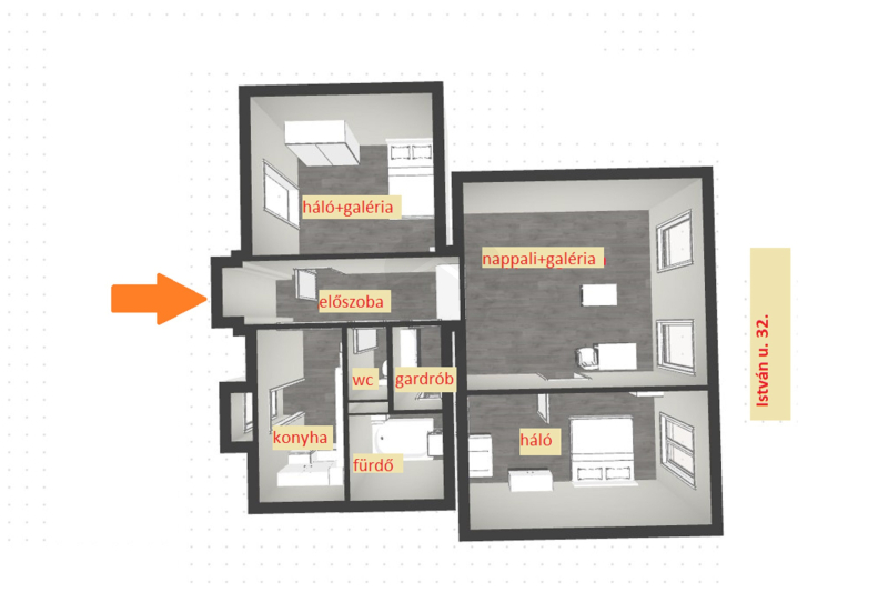 Az ingatlan 80 négyzetméteren terül el, három tágas szobával,és plusz galériákkal, valamint egy jól megtervezett fürdőszobával rendelkezik, így bőven van hely a kényelmes élethez.