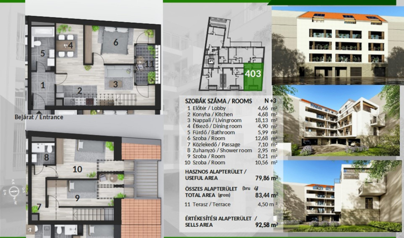 Az ingatlan alapterülete 93 nm, amely négy tágas szobát rejt,a belső 2 szinten elosztva, így bőséges teret biztosít a mindennapi élethez. Az alsó, és felső szinten is található fürdőszoba egyedi tervezésű, és a világos amerikai konyhás nappali tökéletes helyszín a családi összejövetelekhez vagy baráti találkozókhoz.