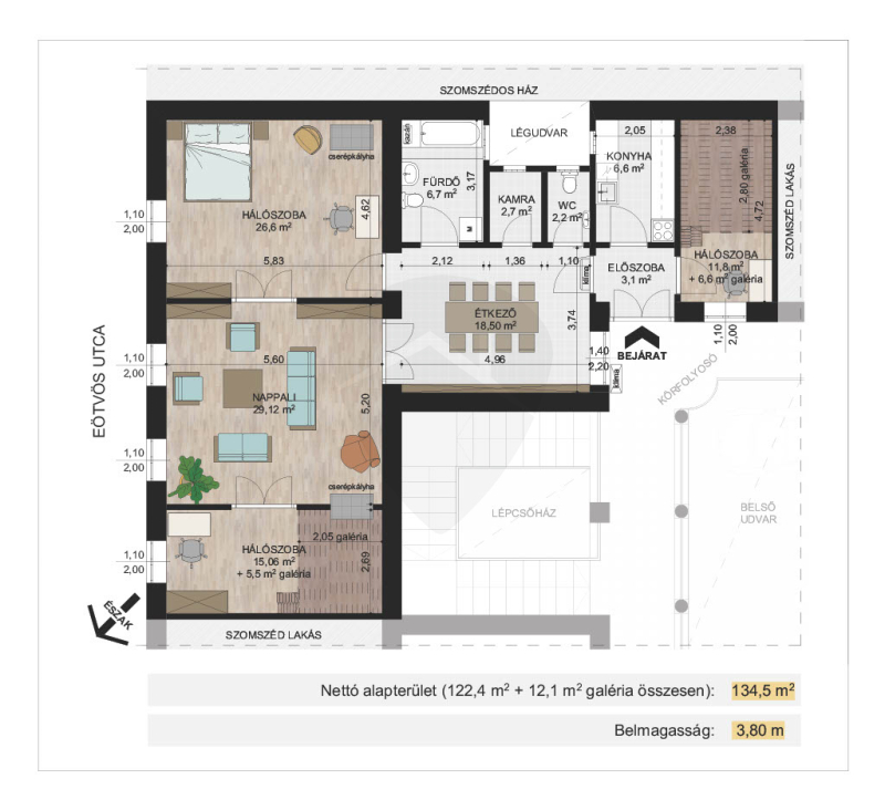 Alapterület: 122,4 m² + 12,1 m² galéria