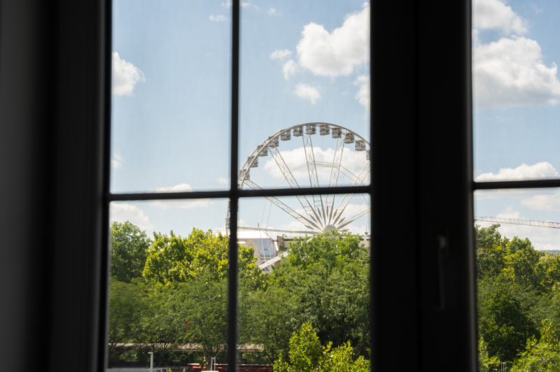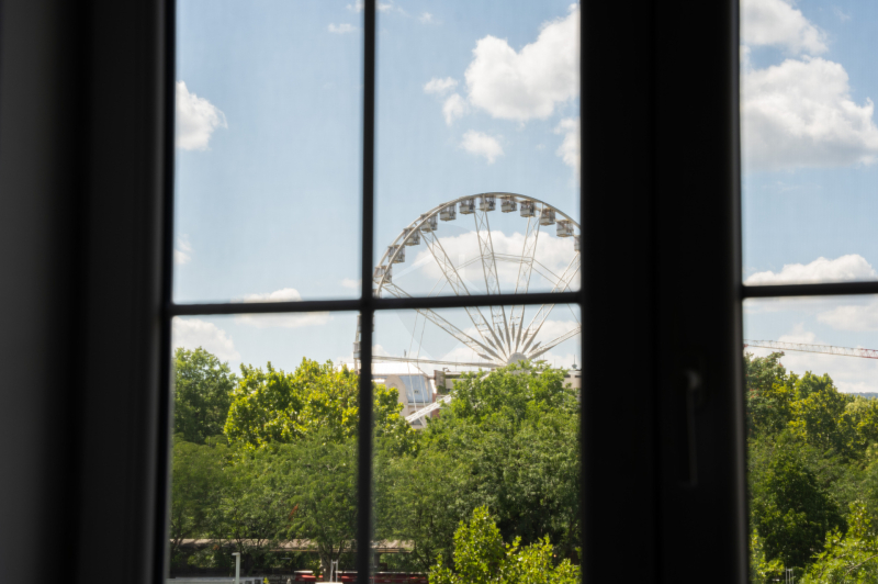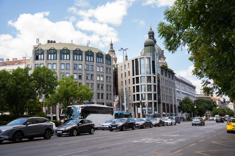 Az Erzsébet tér látványa nem csak díszlet – ez az otthon része. A hatalmas ablakokon át beszűrődő fény, a város mozgása és ritmusa minden pillanatban jelen van, mégis tökéletes egyensúlyban áll a belső tér letisztult nyugalmával.