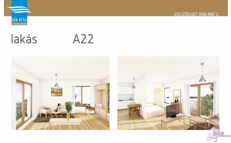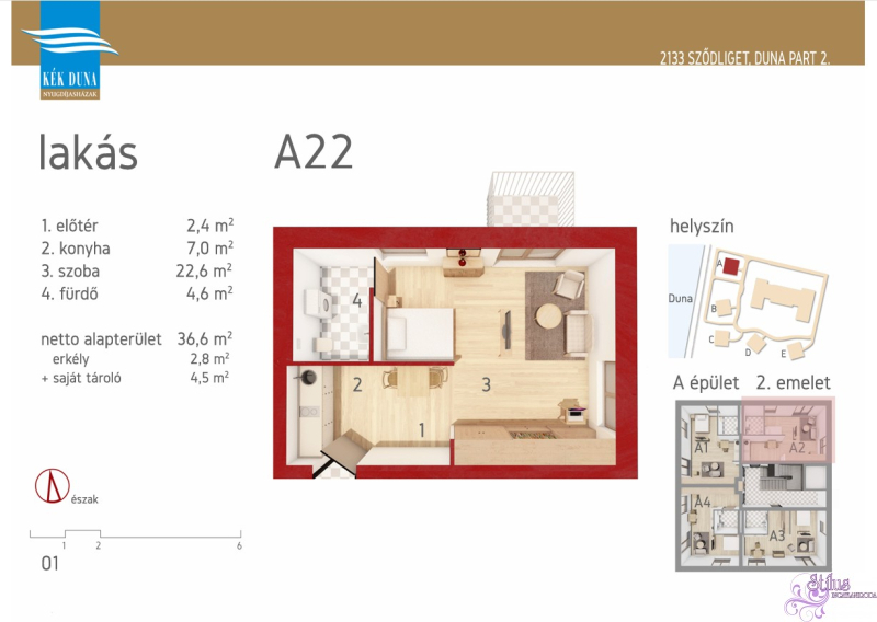 A hirdetésben feltüntetett lakás (A22) a 2. emeleten található, Észak-Keleti fekvésű 36,6 nm alapterületű, melyhez 2,8 nm-es erkély tartozik Az ingatlanban amerikai konyhás nappali, háló és fürdőszoba kerül kialakításra. Igény szerint a háló leválasztható.