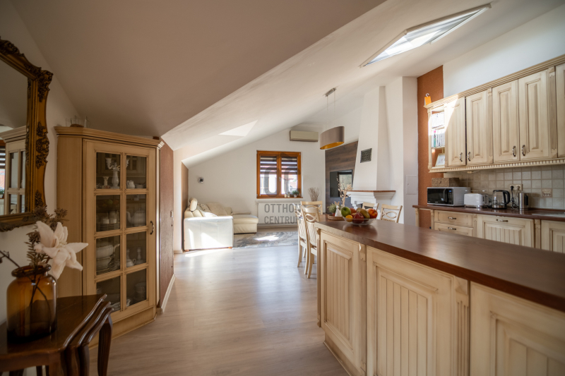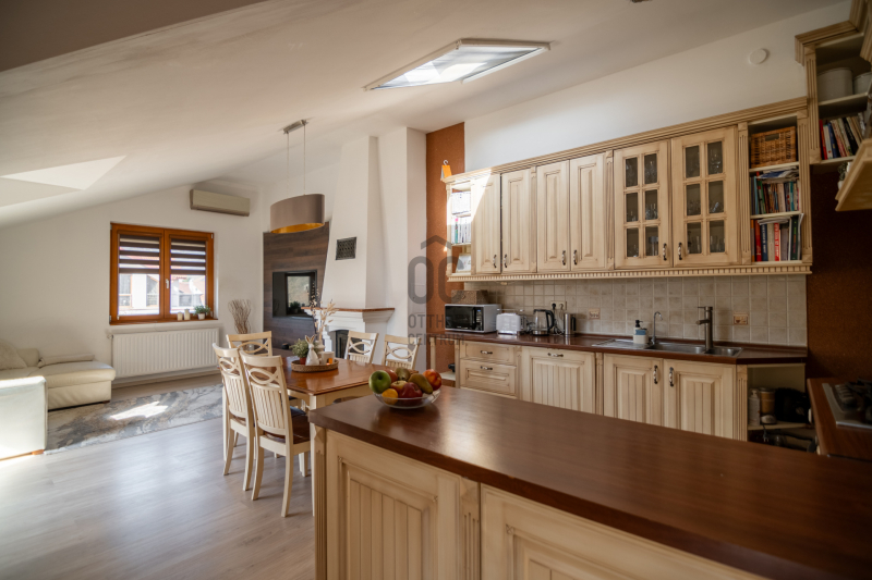 A képeken látható beépített konyhabútort, fürdőszobabútort az ár tartalmazza, valamint a beépített szauna is a lakás ékessége.