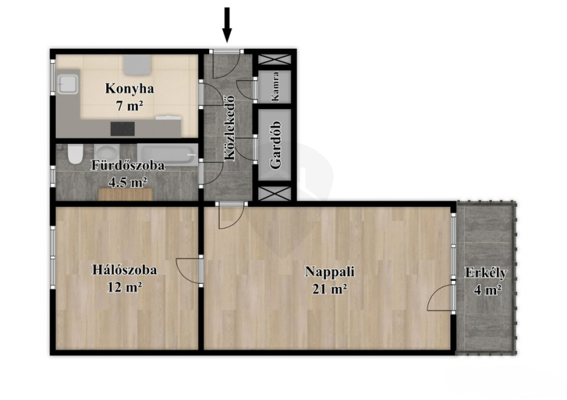 A lakás nagy előnye, hogy kamrája is és gardróbja is van, így a tárolás könnyedén megoldott.