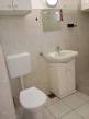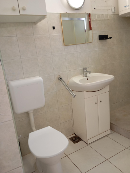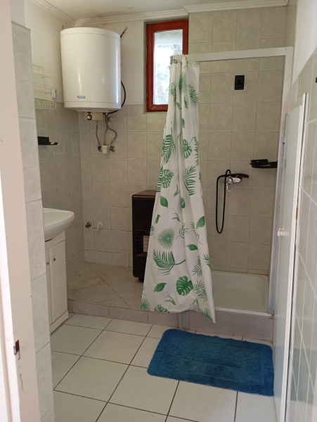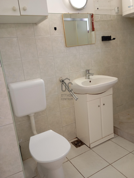 A fürdőszoba egybenyitott, zuhanyzós, ami kényelmes használatot biztosít.