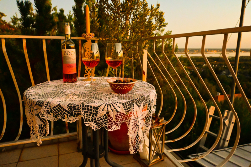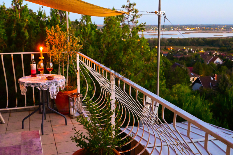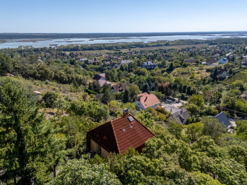 A ház parádés kilátással rendelkezik a Velencei-tóra és a Velence-Sukoró közti völgy minden szegletére. A teraszon állva elmélázhatunk, hogy az egyes házakban milyen lehet élni, a kertjeikben milyen szép fák vannak, a szőlősorok hú, mennyi munkát adhatnak a művelőjüknek, vagy szemünket nyugtathatjuk a képet szegélyező erdősávon. Látjuk, de mégis diszkrét, érezzük, hogy távol vagyunk, fent, a magasban. És a tó... a csillanó vízzel, a nádszigetekkel, a vitorlásokkal...