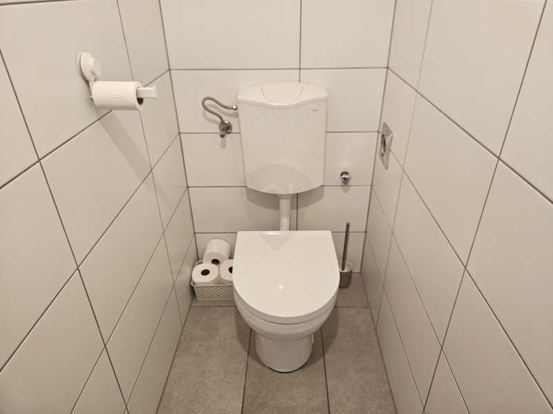 A fürdőszoba kádas, és a wc külön helyiségben található. Kényelmet szolgálja, hogy a mosógépet nem kell a fürdőszobába bepréselni, hisz külön mosókonyha áll rendelkezésre, ahol még helyet kapott a szárítógép és a kondenzációs kazán is.