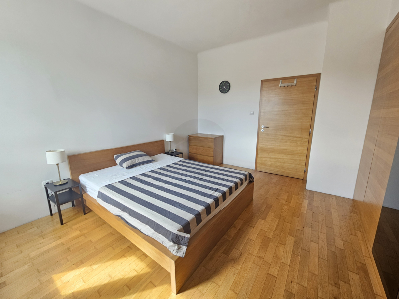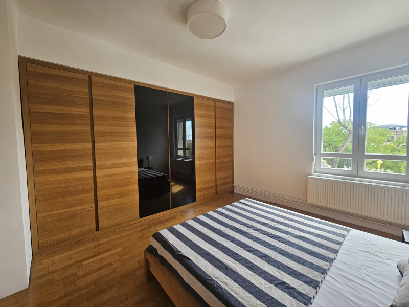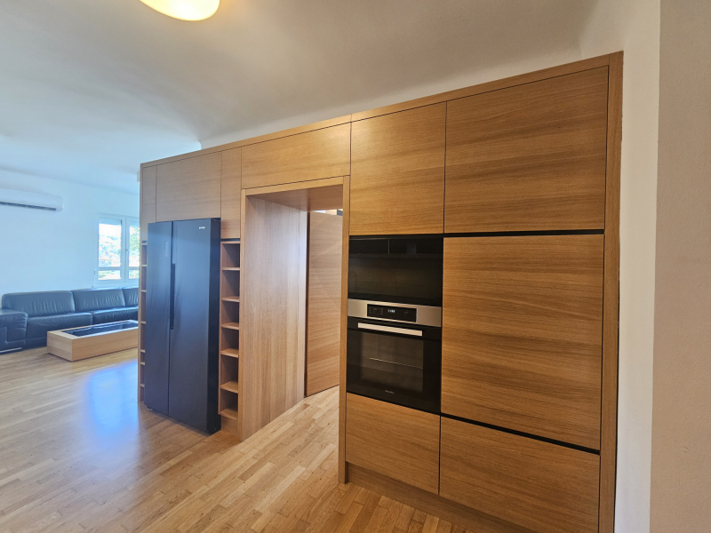 Az amerikai konyhás nappali előnye a rengeteg ablak, és jól rendezhető az étkező és nappali rész is. A konyha egyedi modern időtálló a fa és magasfényű fekete elemeknek köszönhetően. A bútorban rengeteg tároló és praktikusan nyíló szekrények találhatóak, még kamrafunkció is van. Jelenleg az erkélyt beépítették, így dupla hangszigetelt és hőszigetelt nyílászárók megadják azt a csendet ami egy család számára fontos. Két külön hálószobája van, az egyikben franciaágy és beépített jól berendezett gardrób található.