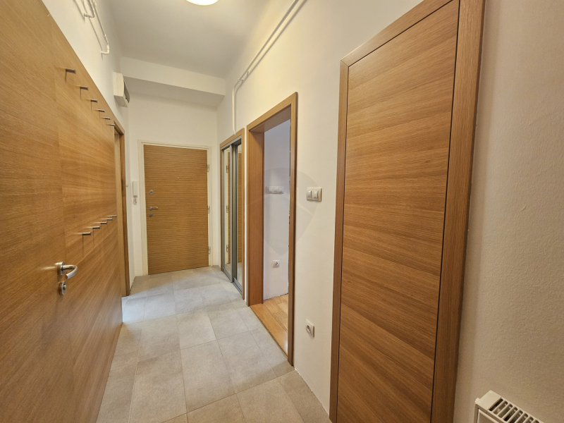 A lakásba lépve egy kényelmes előszobában vagyunk, melynek egyik nagy előnye, hogy két falba épített beépített szekrénye van, biztosítva ezzel a kabátok és cipők tárolását. Mind a belső falburkolatok mind a beltéri ajtók ki lettek cserélve, ez a színvilág kíséri végig az egész lakást. A vizes helyiségekben igényes járólap található, a szobákban pedig eredeti fa parketta.