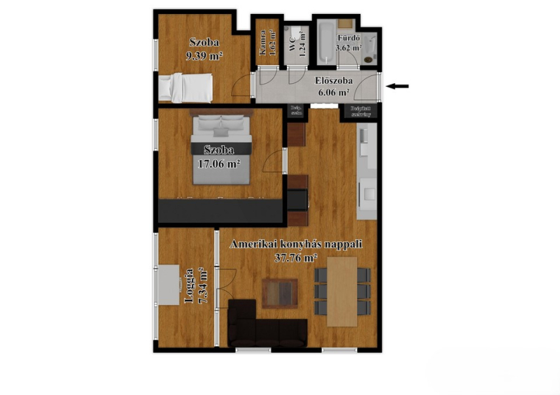 Azonnal költözhető, az ár tartalmazza a minőségi beépített bútorokat az ide illő étkezőt, kanapét, így ide elég lesz tényleg csak a személyes dolgokkal költözni.