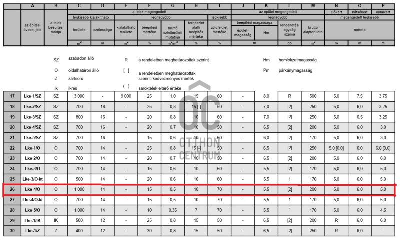 - Övezet: Lke-4/O közepesen intenzív, oldalhatáron álló, kistelkes hegyvidéki kertvárosias lakóterület