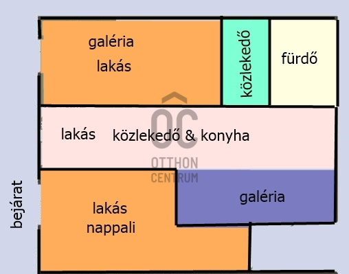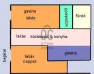 A lakás alapterülete meghaladja a 45 m²-ert , a hivatalos beosztás szerint előtér, konyha, nappali, háló, közlekedő, fürdőszoba, külön WC és tároló található benne. A terek a valóságban jóval tágasabbnak érződnek, mivel a szobák galériás kialakításúak, ezáltal a lakás praktikusabb és sokoldalúbban használható.