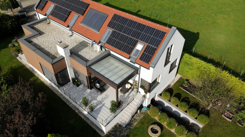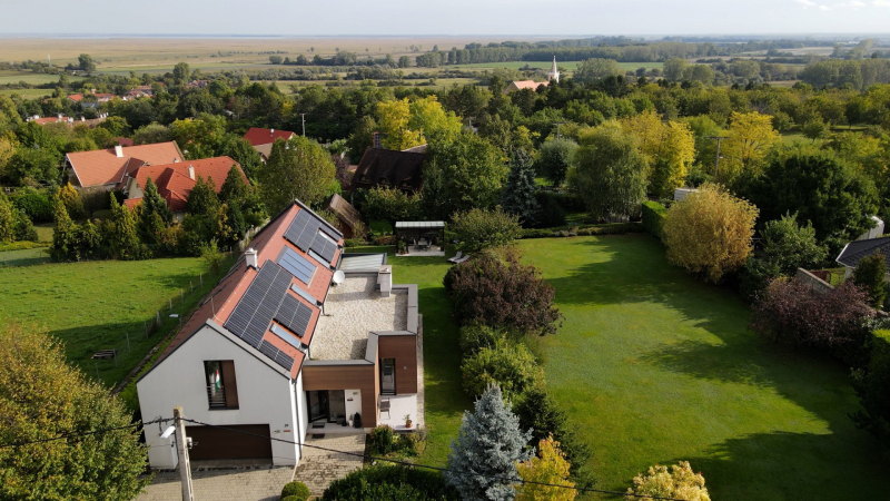 A melegről egy gáz-cirkó kazán gondoskodik padlófűtéssel. A villanyszámlát egy-az egyben fedezi a 9 kW teljesítményű napelem rendszer és még 7 évig szaldós elszámolás lesz. A 44 cm-es porotherm tégla 10 cm-es hungarocell szigetelést kapott.