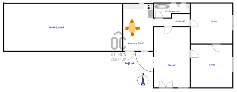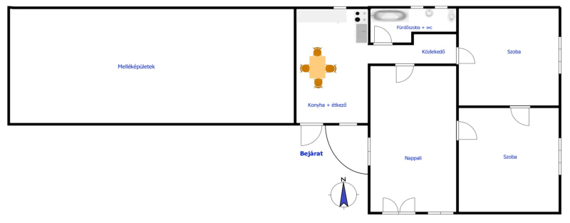 -konyha+ étkezőből nyíló közlekedő, fürdőszoba egyben a wc- vel és 3 nagyobb méretű szoba