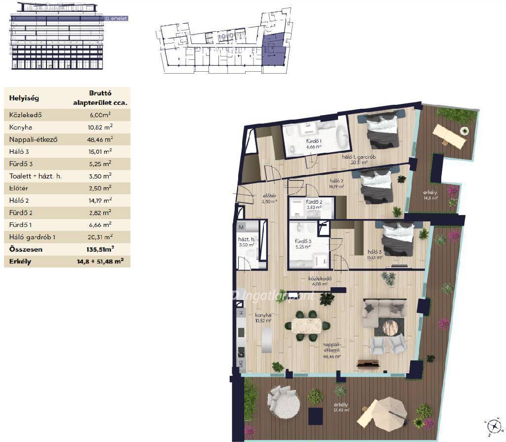 * Elosztás: Nappali + 3 hálószoba, gardrób, 3 fürdőszoba